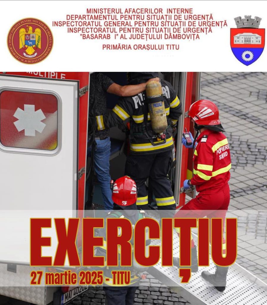 Joi, 27 martie, începând cu ora 10:00, Inspectoratul pentru Situații de Urgență „Basarab I” al județului Dâmbovița va desfășura un exercițiu de intervenție în orașul Titu, simulând efectele unui cutremur asupra unor blocuri de locuințe.